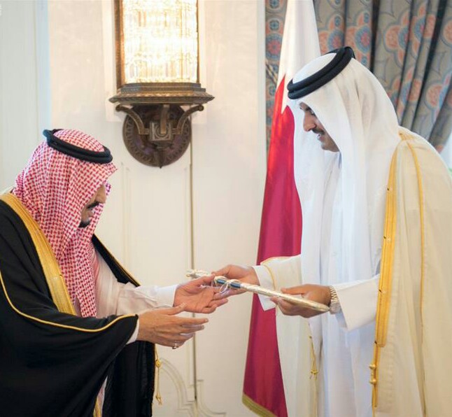 بالفيديو.. خادم الحرمين بعد تسلمه سيف جاسم من أمير قطر يأمر بوضعه في الدرعية